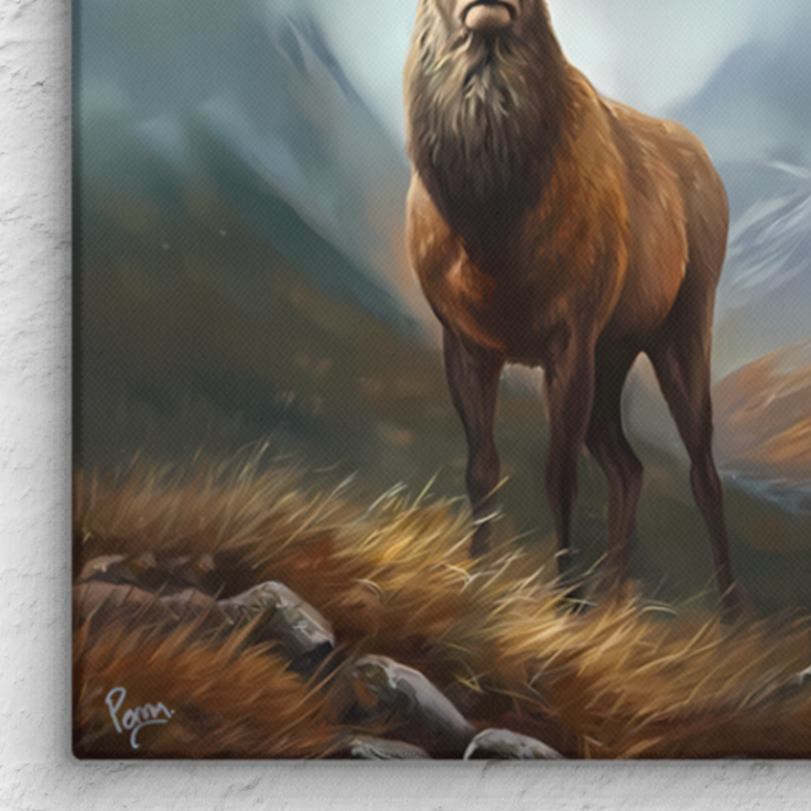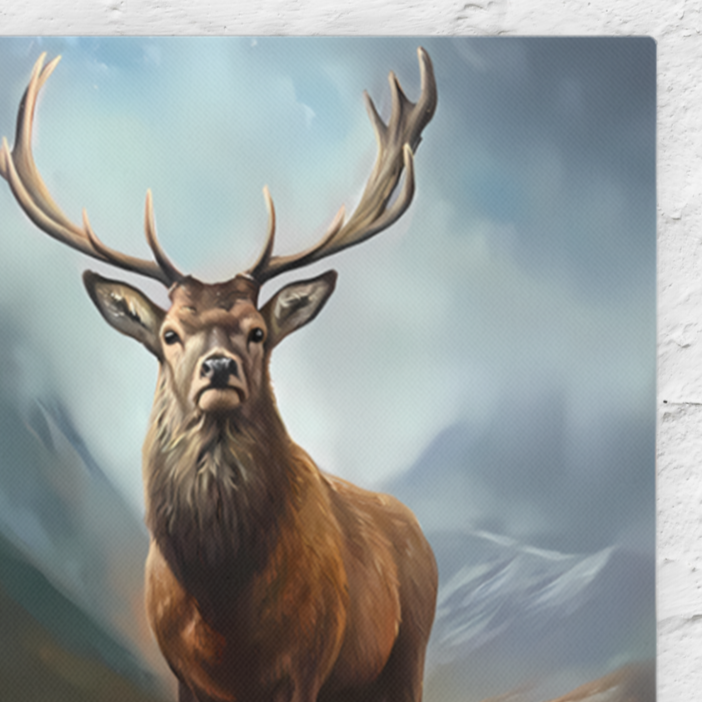 This painting captures a majestic deer standing proudly atop a mountain, its impressive antlers spreading wide and commanding attention. The artwork highlights the natural grace and strength of the animal, set against a rugged, elevated landscape that emphasizes its dominance and beauty in the wild.