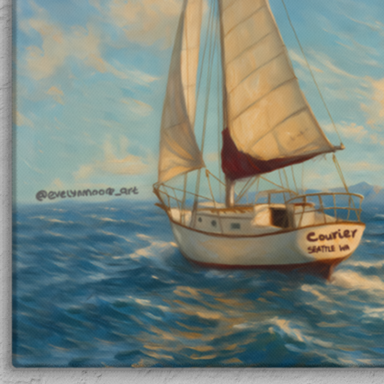 Experience the serene beauty of the sea with this expertly crafted painting of a sailboat navigating gentle waves beneath a captivating skyline. The artwork captures the dynamic interaction between ocean and sky, highlighting the sailboat's graceful movement and the subtle play of light on the water. Perfect for those who appreciate maritime artistry, this piece brings a refined coastal ambiance to any space.