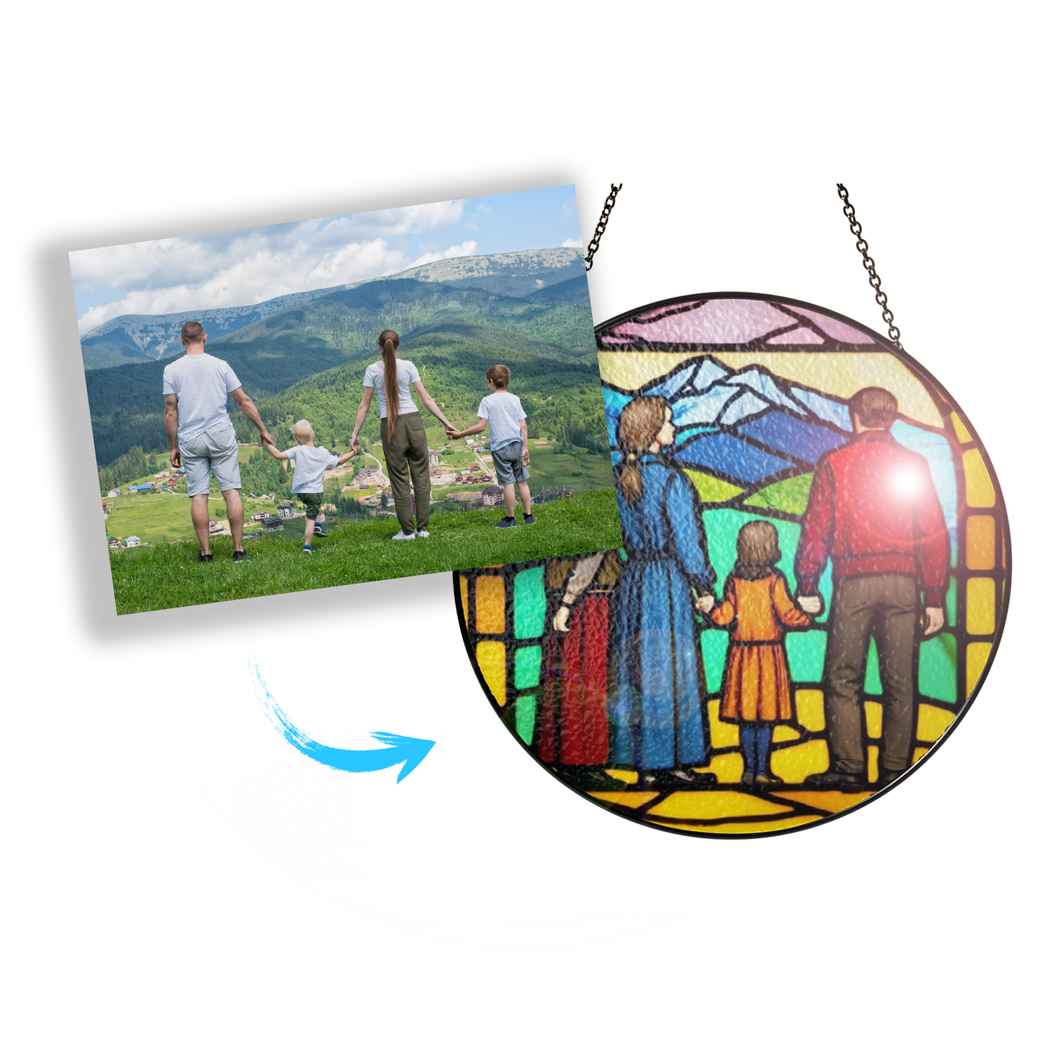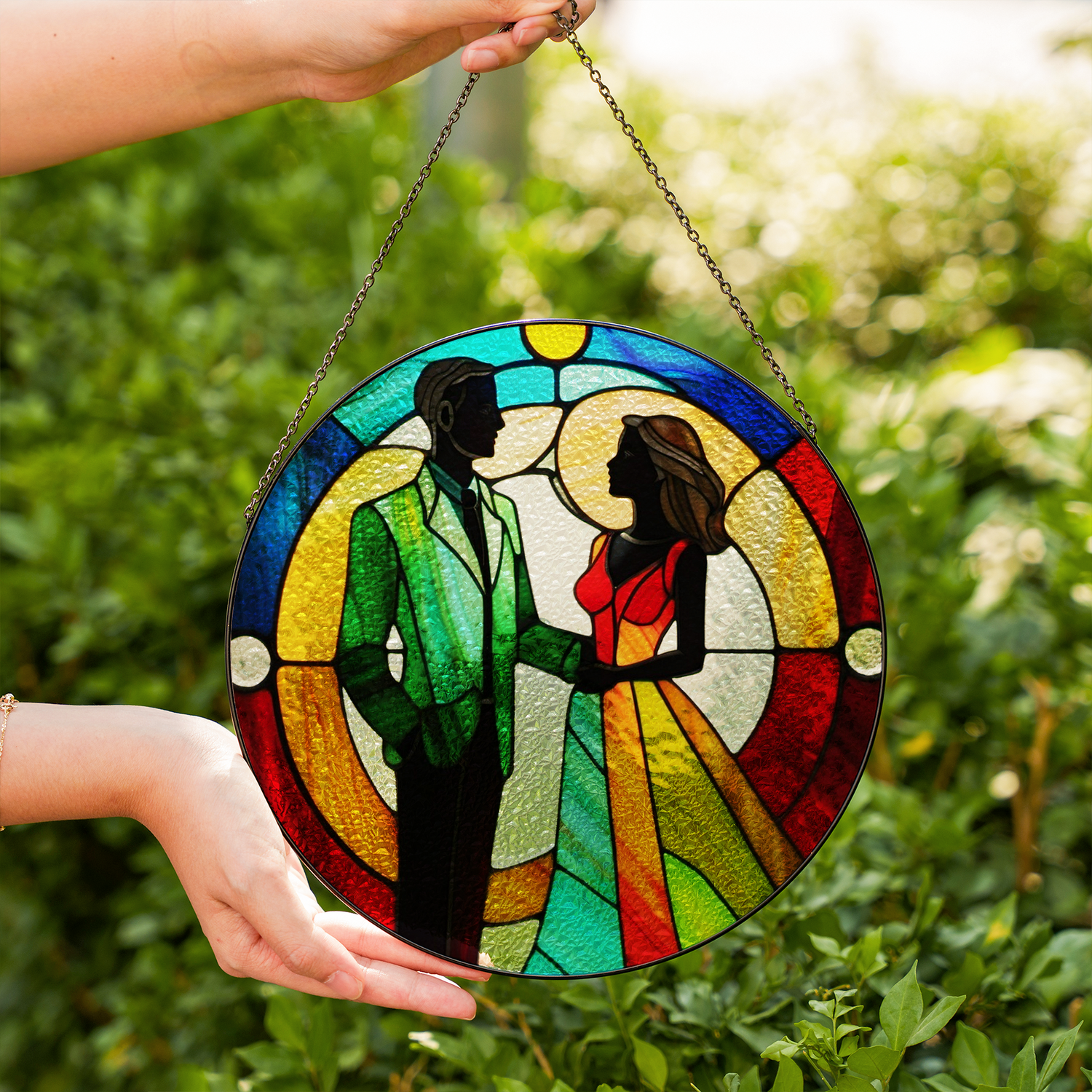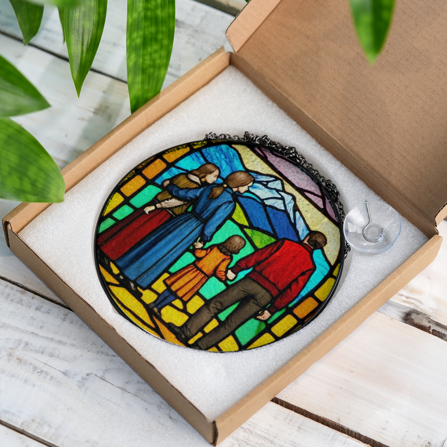 Stained glass comes packed with a 10" metal chain and suction cup for hanging and display.